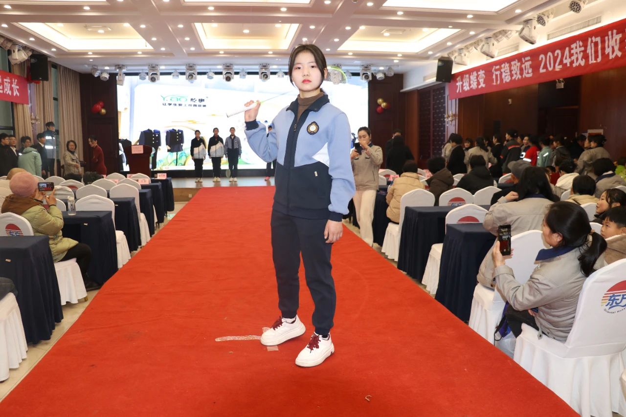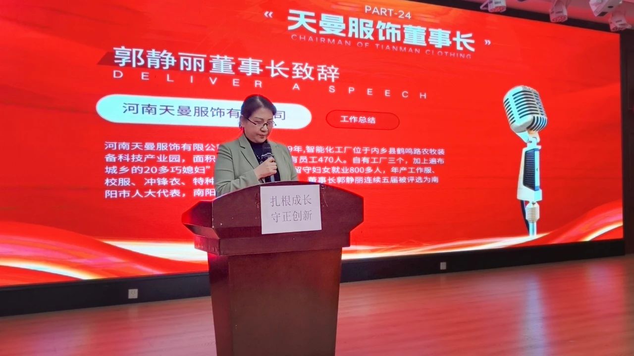 河南天曼服飾董事長郭靜麗,總經理郭靜旭對2024年全體員工的付出表示真誠的感謝,郭靜麗董事長發表了肺腑感人的致辭,全面詮釋了“扎根成長、守正創新”的發展思想,全體員工倍受鼓舞,掌聲不斷!