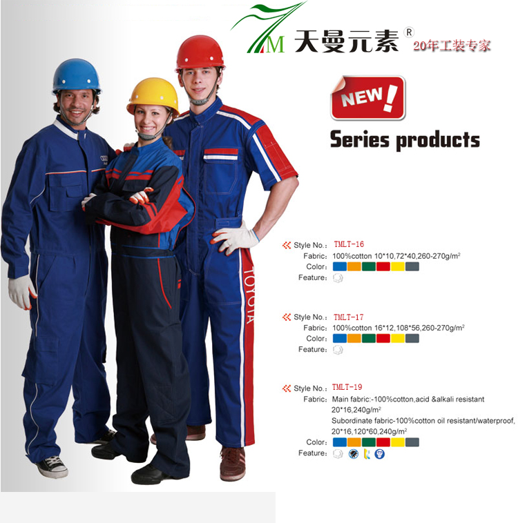 • 產品簡介:產品詳細描述 : TMLT-16 面料:100% 純棉,10*10,72*40,260-270 GSM;前胸繡花汽車品牌標志,前門襟樹脂拉鏈,兩個帶蓋胸兜和兩個斜插褲兜,后背臀部貼兜,腿部工具兜,腰部松緊帶 TMLT-17 面料:100% 純棉,16*12,108*56,260-270 GSM;前胸繡花標志,前門襟樹脂拉鏈,兩個帶蓋胸兜和兩個斜插褲兜,后背臀部貼兜,腿部工具兜,腰部松緊帶 TMLT-18 面料:100% 純棉,20*16,240 GSM,防酸,防堿;腿部TOYOTA繡花標志,前門襟樹脂拉鏈,兩個帶蓋胸兜和兩個斜插褲兜,后背臀部貼兜,腿部工具兜,腰部松緊帶,腰部魔術貼可以調節松緊。